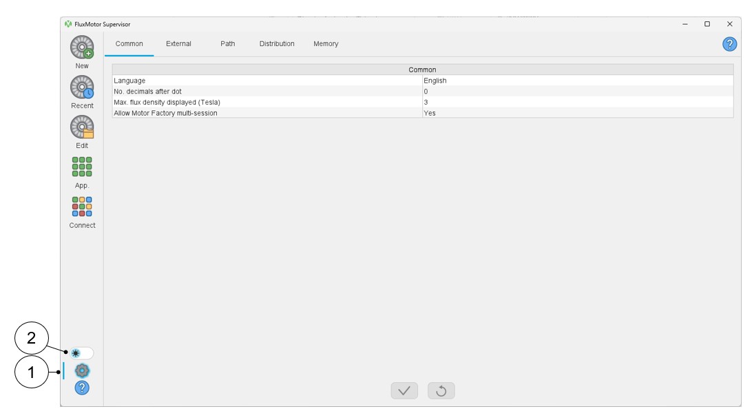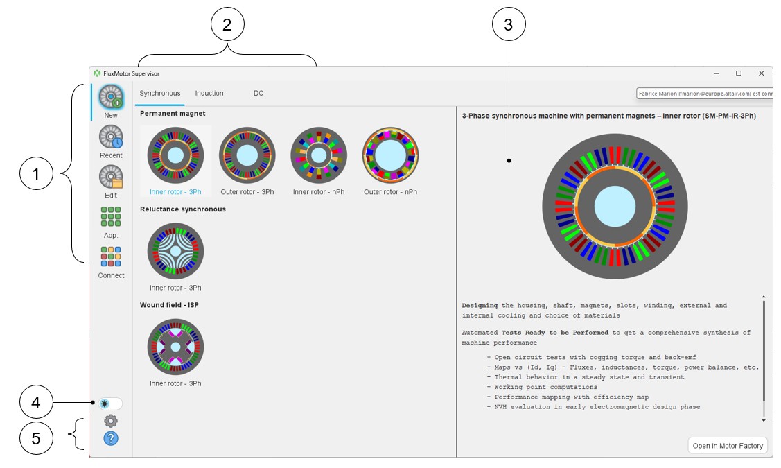 | 1 | Main entry points of the supervisor – New motor in Motor Factory, edit a Recent motor, Edit a motor from catalogs, Open FluxMotor satellite Applications, and Open Altair® solutions. |