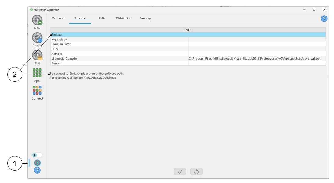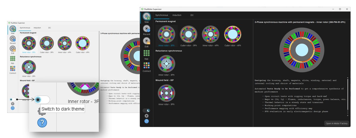 - “Connect”: is a new label allowing access to a dedicated section that gives access to external software that is needed and complementary for FluxMotor: Flow Simulator™, Flux®, HyperStudy™, PSIM™, SimLab®, Twin Activate®, Siemens Simcenter Amesim.