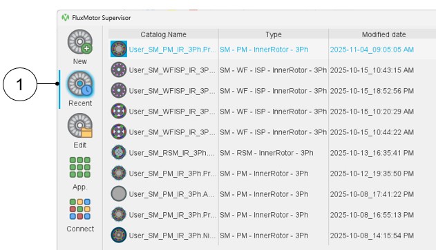 Figure 2. FluxMotor – Supervisor – Edit Recent Motors (1) to edit a recent project. Up to 100 projects can be stored on this list.