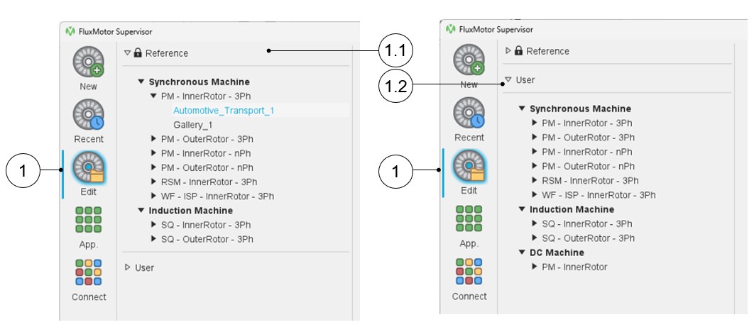 1 “Edit”: To select and edit a project from the catalogs, standard and user catalogs like what can be done when using Motor Catalog 1.1 The reference catalogs have been selected and are deployed, and others (User) are folded. 1.2 The user catalogs have been selected and are deployed, and others (Reference) are folded. - Connect to external softwareOnce you select the button “Connect” – Among the list of external software that are needed and complementary for FluxMotor, a new one is now available: “Siemens Simcenter Amesim” which is a mechatronic systems simulation platform that allows design engineers to virtually assess and optimize the systems’ performance.Note: For SMPM machines, a new export allows us to build and export maps from FluxMotor to Amesim for performing system behavior analysis.