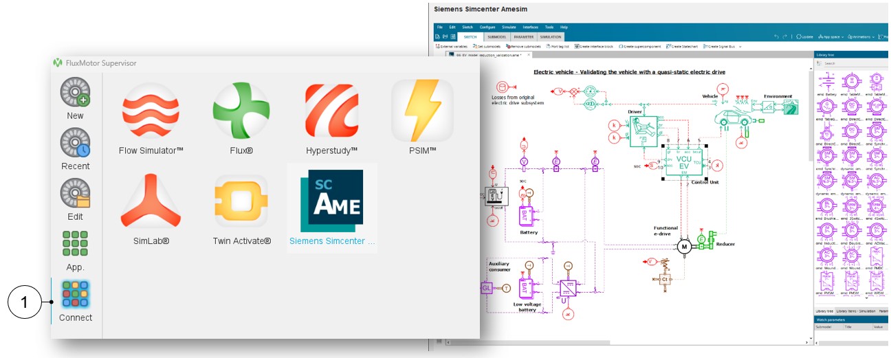 Figure 3. FluxMotor – Supervisor – Connect – Access to Siemens Simcenter Amesim 1 – “Connect”: is a new label allowing access to external software that is needed and complementary for FluxMotor.