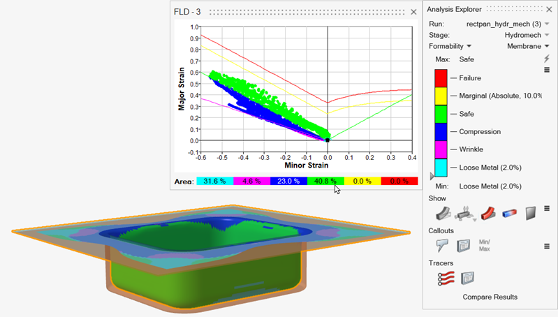material is not sufficiently deformed.Note: When viewing Formability results in the Analysis Explorer, the Area display shows the percentage of the model's surface area that is represented by each status.