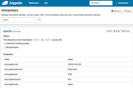 3. Click the edit button and modify the interpreter to enter your Graph Lakehouse deployment details and make a secure connection to the database. The list below describes each interpreter setting: