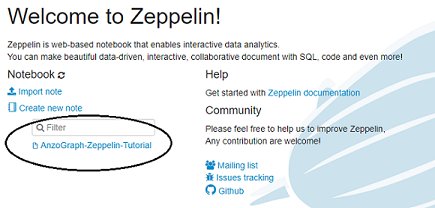 Connect Zeppelin to your Graph Lakehouse deployment by following the instructions in Connecting to Graph Lakehouse below. If you want to get started with a sample notebook, see Downloading the Tutorial Notebook.