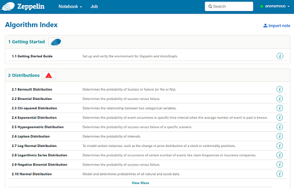 Each notebook provides details and example usage for one of the Graph Lakehouse Data Science functions. You can click a notebook name to open the file. It might take some time to load all of the contents. To run the queries in a sample notebook or write and run your own queries run against Graph Lakehouse, connect Zeppelin to Graph Lakehouse by following the instructions in Connecting to Graph Lakehouse below. For more information about the data science functions, see Data Science Library. For information about using Zeppelin, see the Zeppelin Documentation.