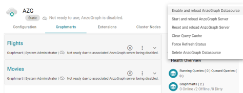 | Keep Graph Lakehouse Datasource Enabled on Anzo Startup | This option is enabled by default and means that Graph Studio leaves the Graph Lakehouse data source online in a "Ready to use" state if Graph Studio is restarted (if this data source is online at the time Graph Studio is restarted). When this option is disabled, Graph Studio disables this data source when Graph Studio is restarted. When Graph Studio comes online, this source must be manually enabled by selecting Enable and reload Graph Lakehouse Datasource from the menu on the Graph Lakehouse administration screen. For example:
