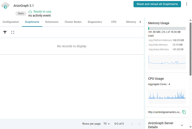 To change configuration details, click the Configuration tab and adjust values as needed. The right side of the screen shows memory and CPU usage as well as server and graphmart details.