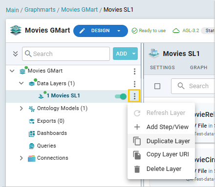 If you want to clone a layer from the current graphmart, click on the menu to the right of the layer and select Duplicate Layer.