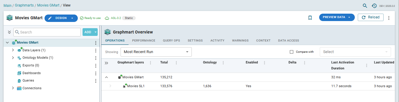 - Click the name of the graphmart that you want to add a layer to. The graphmart object tree and the Graphmart Overview frame are displayed. For example: