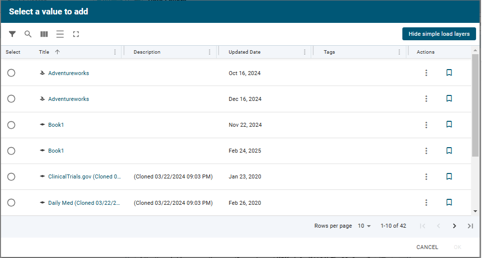 Graph Studio opens the Select a value to add dialog box, which lists the existing layers for all graphmarts. For example: