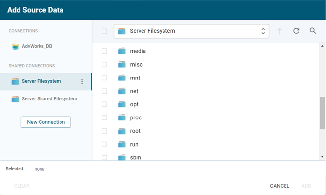 If you choose to add source data from a connection, the Add Source Data screen opens. On the left pane, it lists Shared Connections (Data Files, Server Shared Filesystem, other storage. Previously saved connections are shown at the top left.