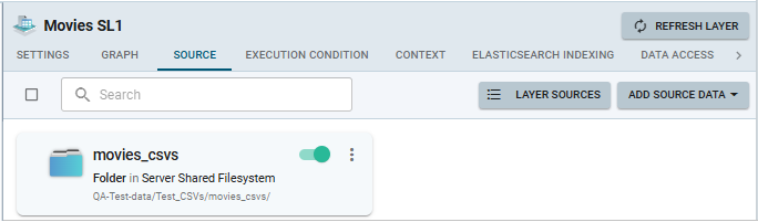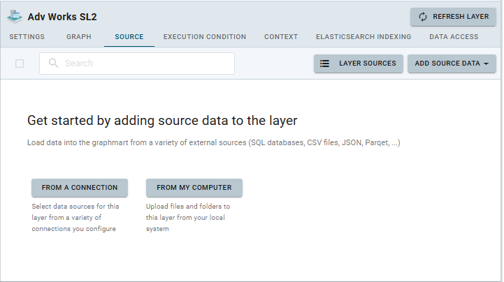 If you select the Source Layer option when Creating a New Layer, you can add source data to the layer (i.e., load data into the graphmart from a variety of external sources, such as SQL databases, CSV files, JSON, Parqet,etc.