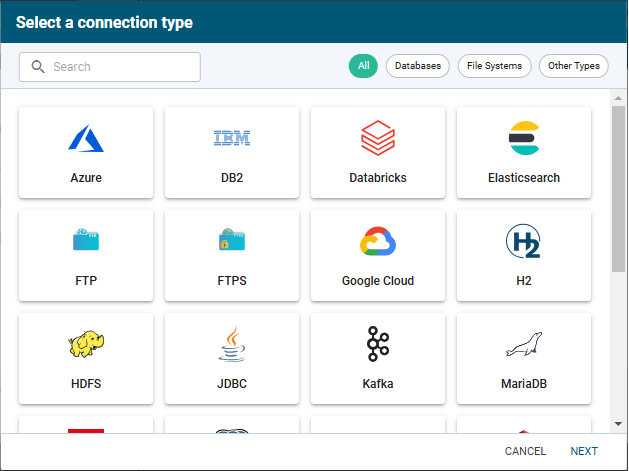 Search the desired type or use the filters “Databases”, File Systems”, "Other Types” at the top of the screen.