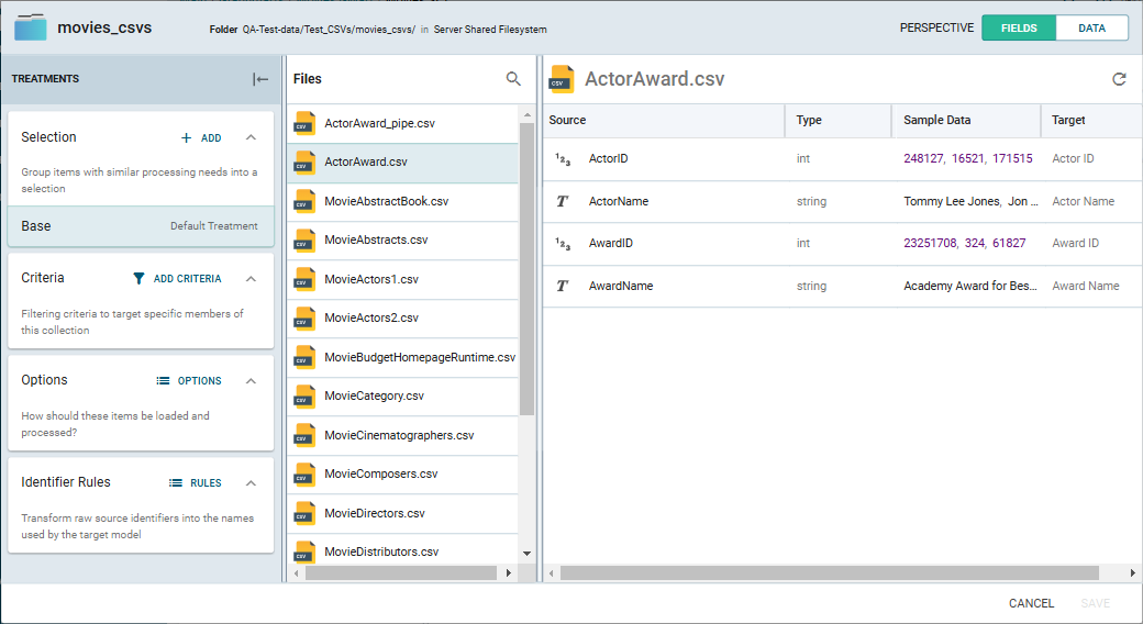 This will list the folder contents - the source files along with their metadata - and the Treatments pane on the left. Click on an individual file in the list. Fields information is shown by default. Click Data in the Perspective switch at the top right to preview the data in the selected file.