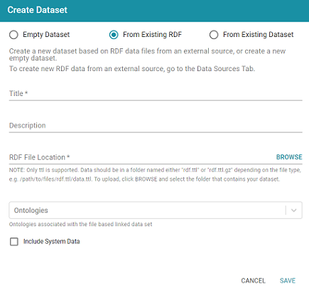 - Lastly, the RDF Format setting defaults to ttl.gz, meaning files that are output to this dataset will be in compressed Turtle format. This is the ideal format for preserving space on the file store. If you do not want the files to be compressed, you can change the value to ttl.