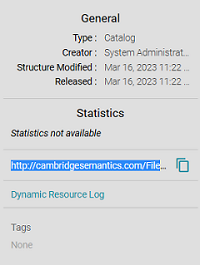 Graph Studio displays dataset details on the Overview screen for the dataset. To view and copy a dataset URI, go to the Overview tab for the dataset. The URI is under General information on the right side of the screen. You can click the clipboard icon () to copy the URI.