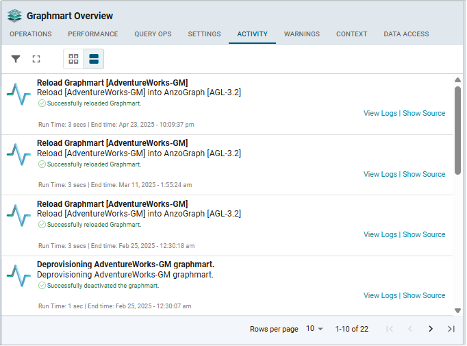 The Activity tab shows the target-filtered list of the Activity Log specific for this graphmart.