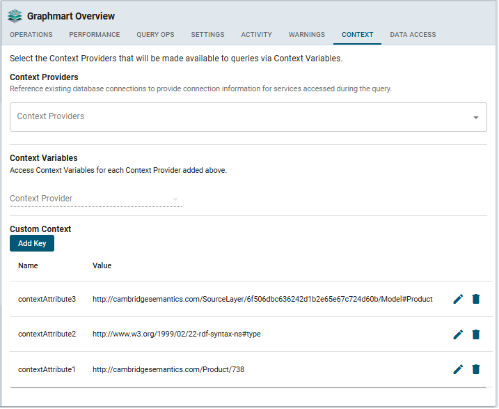 Select the Context Providers that will be made available to queries via Context Variables. For Context Providers, reference existing database connections to provide connection information for services accessed during the query. You can add, delete, and edit (update) context keys in this tab.
