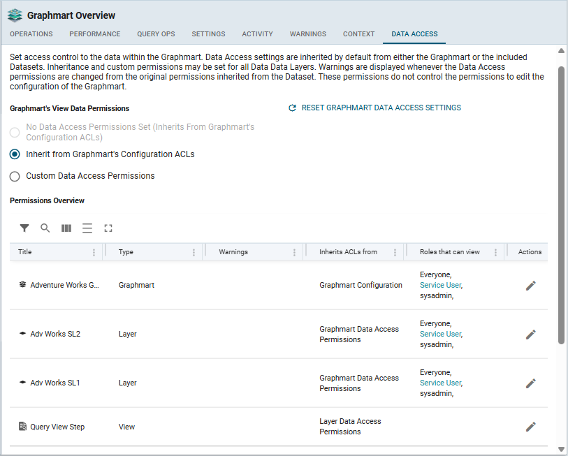 Data Access settings defined here are inherited by default from either the graphmart or the included datasets. Inheritance and custom permissions may be set for all Data Layers. Warnings are displayed whenever the Data Access permissions are changed from the original permissions inherited from the Dataset. These permissions do not control the permissions to edit the configuration of the graphmart.