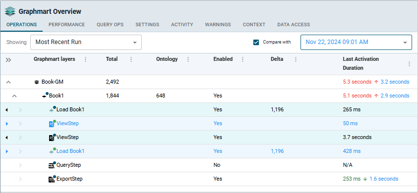 At the top-right corner of the frame, select the "Compare with" box, then select the run whose activation metrics you would like to compare with the most recent ones. The table below will highlight the components whose metrics differ, indicate an increase or decrease in the number of statements or ontologies, show how many layers are no longer loading, indicate the difference in the duration of activation: