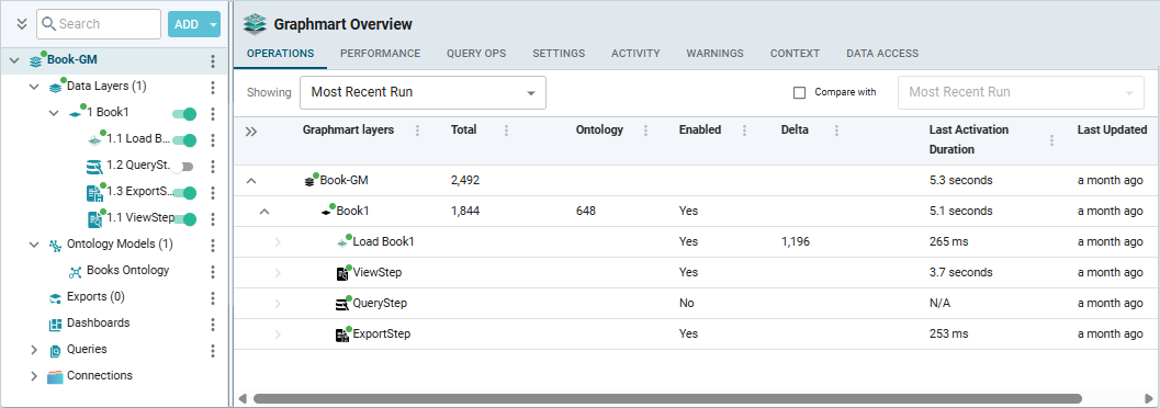 The Operations tab stores activation metrics - the information about the activation, reloading, and refreshing of a graphmart. You can see how many statements were inserted, how many of those were in the ontology, how long the reload or refresh took for each of the steps or layers, etc. This information is stored in a graph, and you can specify how many of them you want to store for each graphmart.