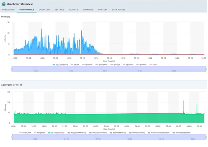 The Performance tab in Graphmart Overview shows the CPU and memory usage for the graphmart. Previously this information was only available in the Admin user interface.