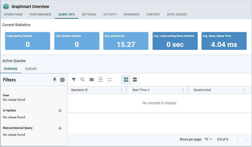 The Query Ops tab provides the view of the current queries going against the Graph Lakehouse server that the graphmart is connected to. It is the same data that you can get in Hi-Res Analytics Dashboards in terms of the currently queued queries and the running queries.