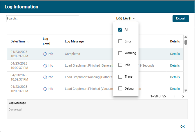 Click View Logs for any of the events in the list to view the detailed log information, specify the log level (All / Error / Warning / Info / Trace / Debug)