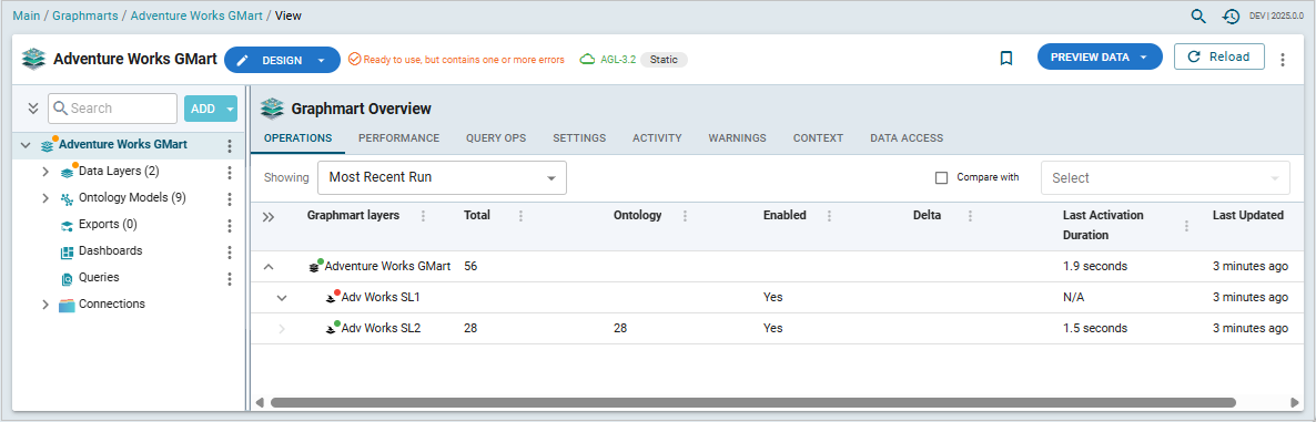 ) on the right-hand side of the bar provides access to the Profile Data, Find Connections, Export, Add to Migration Package, Version, and Sharing features. Note that Sharing allows setting access control on the graphmart's configuration, not permissions controlling data access within the graphmartThe header bar also serves as a status bar providing notifications of errors during reloading or refreshing. The version of that the graphmart is connected to is shown in the middle (for example, AGL 3.2).