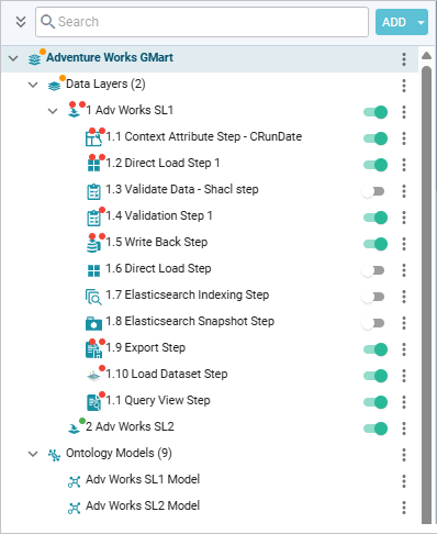 Where applicable, the slider control to the right of the items allows you to enable or disable them. For example, use sliders to enable or disable individual steps underneath the layers in the explorer pane: