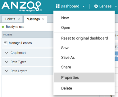 - Open the Properties dialog box for the either dashboard or for a specific lens:
