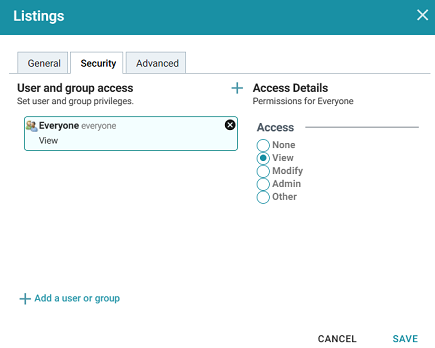 - Access Details: Select the access level for the selected user or group. Refer to Dashboard Level Permissions or Lens Level Permissions above for details about each of the access options.