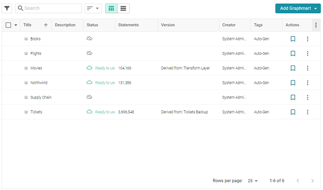 - In the Graph Studio application, go to the resource selection screen for the type of artifact that you want to import. For example, the image below shows the Graphmarts screen: