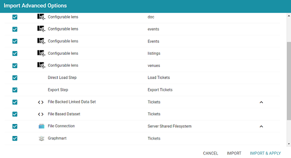 - If you want to import the files so that they become the current, working versions of the artifacts, click Import & Apply. Graph Studio creates a backup version of the existing working versions and then imports the artifacts as the new working versions.