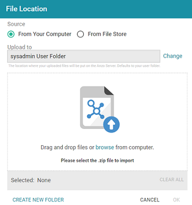 - If the exported .zip file is on your computer, drag and drop the file onto the screen or click browse to navigate to the file and select it. If the .zip file is on a File Store, select the From File Store radio button and select the file on the File Store.