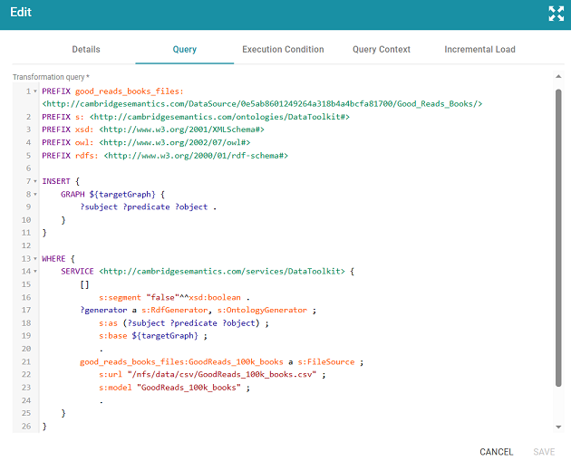 2. Open the Direct Load Step for editing and click the Query tab. For example, the image below shows the query that was generated to onboard data about books from a CSV file: