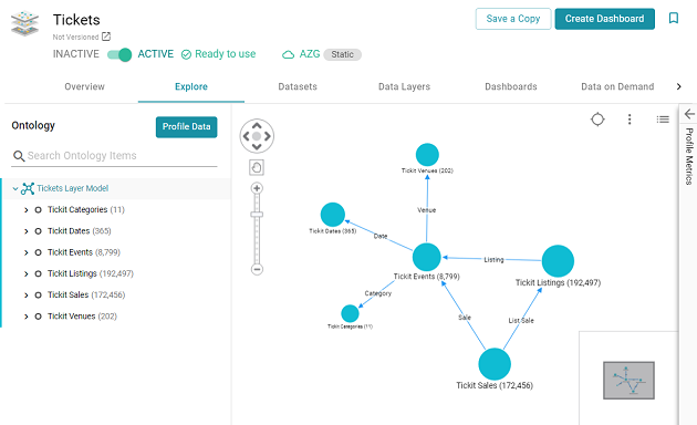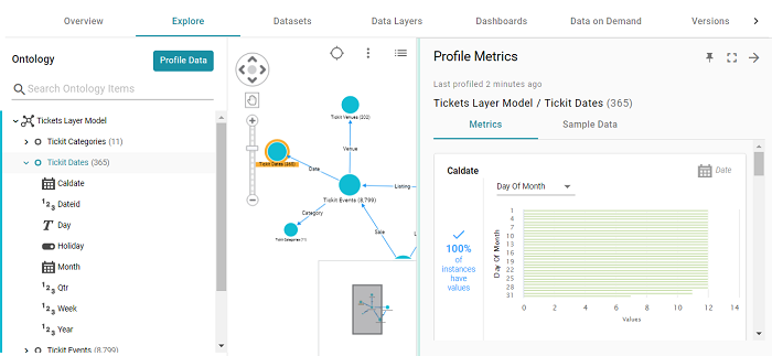 - Once the profiling is complete, the Profile Metrics panel is expanded on the Explore tab. To populate the panel, click a class or property in the Ontology or a class in the graph view in the middle of the screen. For example: