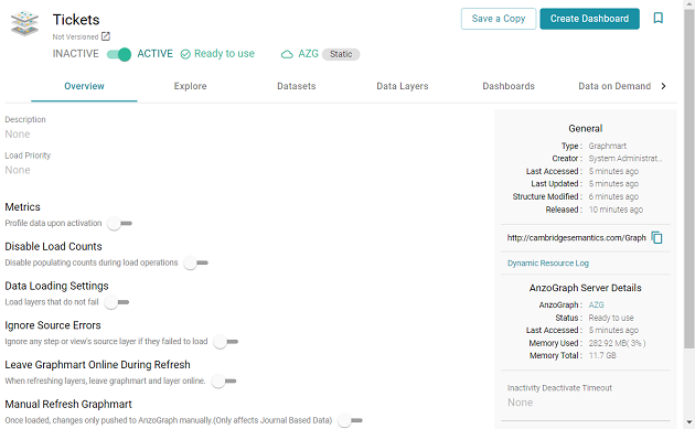 - On the Graphmarts screen, click the name of the graphmart for which you want to generate metrics. Graph Studio displays the Overview for that graphmart. For example: