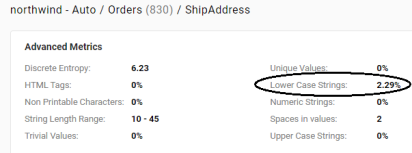 For each string property, this metric computes the percentage of values that have all lower case characters.
