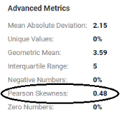 For each numeric property, this metric computes the Pearson coefficient of skewness to show the distribution of values. A value of 0 indicates no skew, a positive number indicates positive skew, and a negative number indicates negative skew.