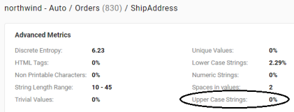- Upper Case Strings: For each string property, computes the percentage of values with all upper case characters.