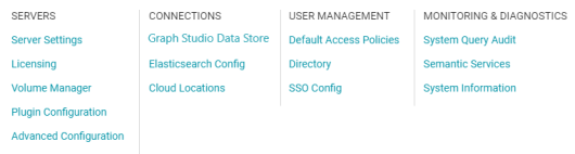 | Administer System Setup | Gives permission to access the options in the Administration application that are related to system setup, such as Server Settings, Licensing, Graph Studio Data Store, and Directory server configuration. The image below shows the view of the Administration menu that users have if Administer System Setup and Graph Studio Application are the only two applied permissions: