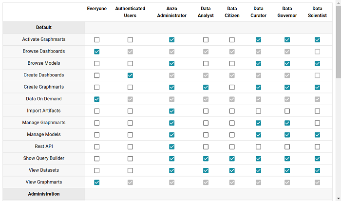 The permissions described below give access to functionality in the Graph Studio and Administration applications. Whether members of the role have view or edit access to certain datasets, models, dashboards, graphmarts, etc. depends on the permissions that are granted at the artifact level.