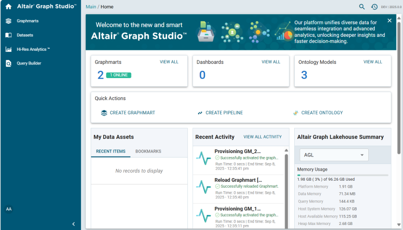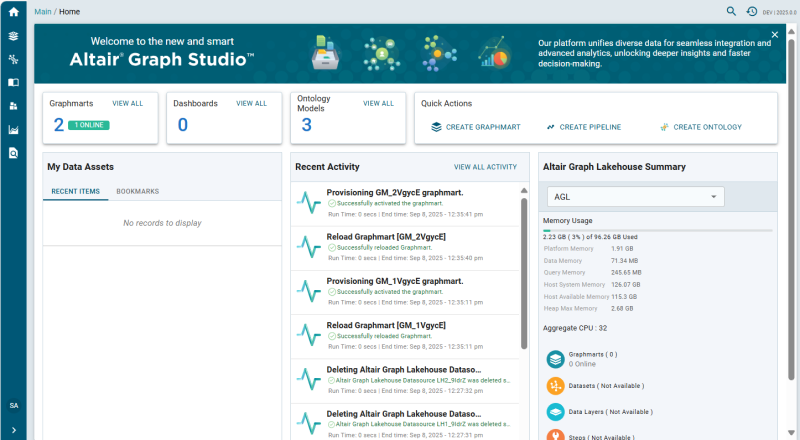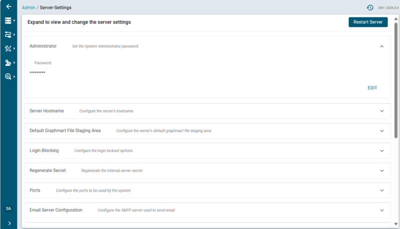 The following image shows an example of the Graph Studio Administrator view of the Administration application.