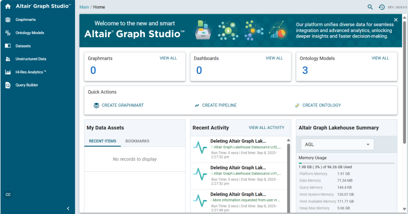 By default the Graph Studio Administrator role has access to all menus and features in the Graph Studio application as well as the Administration application. The image below shows an example of the view a user with the Graph Studio Administrator role has in the Graph Studio application.