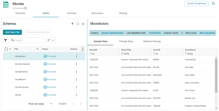 - Click the schema for which you want to assign primary keys. Graph Studio displays the Tables tab for the data source that contains the schema. For example: