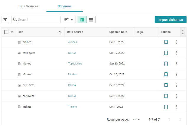 - Click the Schemas tab to view the list of all schemas. (You can also access a schema by selecting the data source that contains the schema.) The image below shows a view of the Schemas tab: