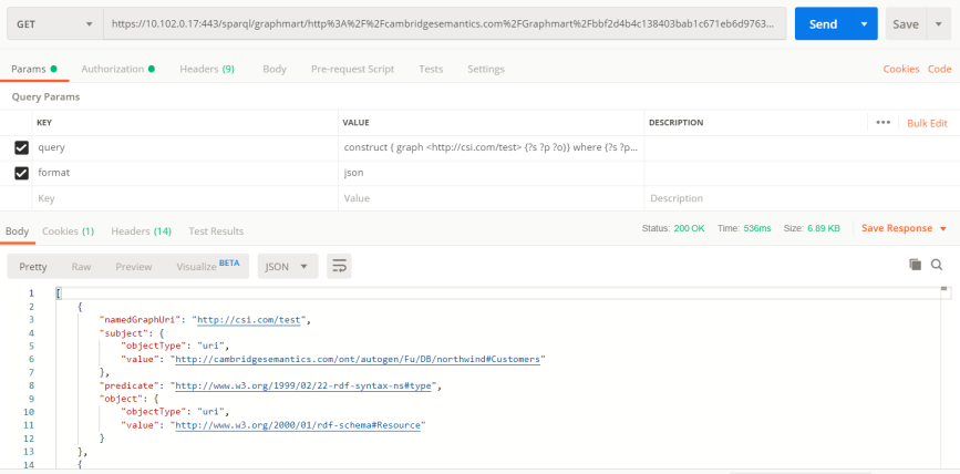 The example below sends a GET request that runs a CONSTRUCT query. The response format is set to JSON, and the results are formatted in Graph Studio JSON RDF Serialization.