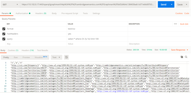 The following example sends a GET request that runs a SELECT query against a graphmart. The format parameter is included to format the results in text/csv serialization.