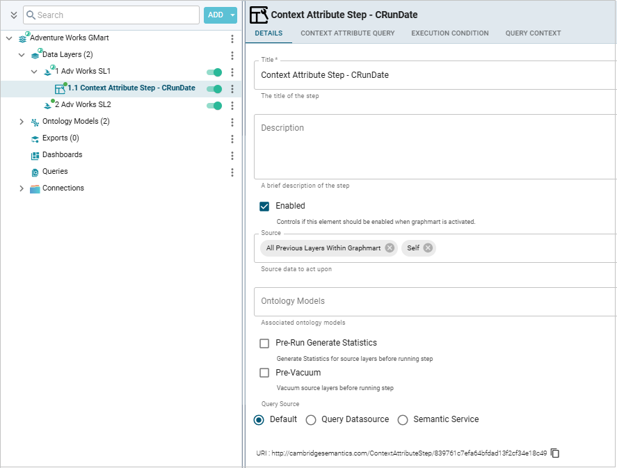 Once the Details tab is configured and the context attribute query is written, the step can be run. For information about running this step conditionally by setting up an execution condition, see Defining Execution Conditions.
